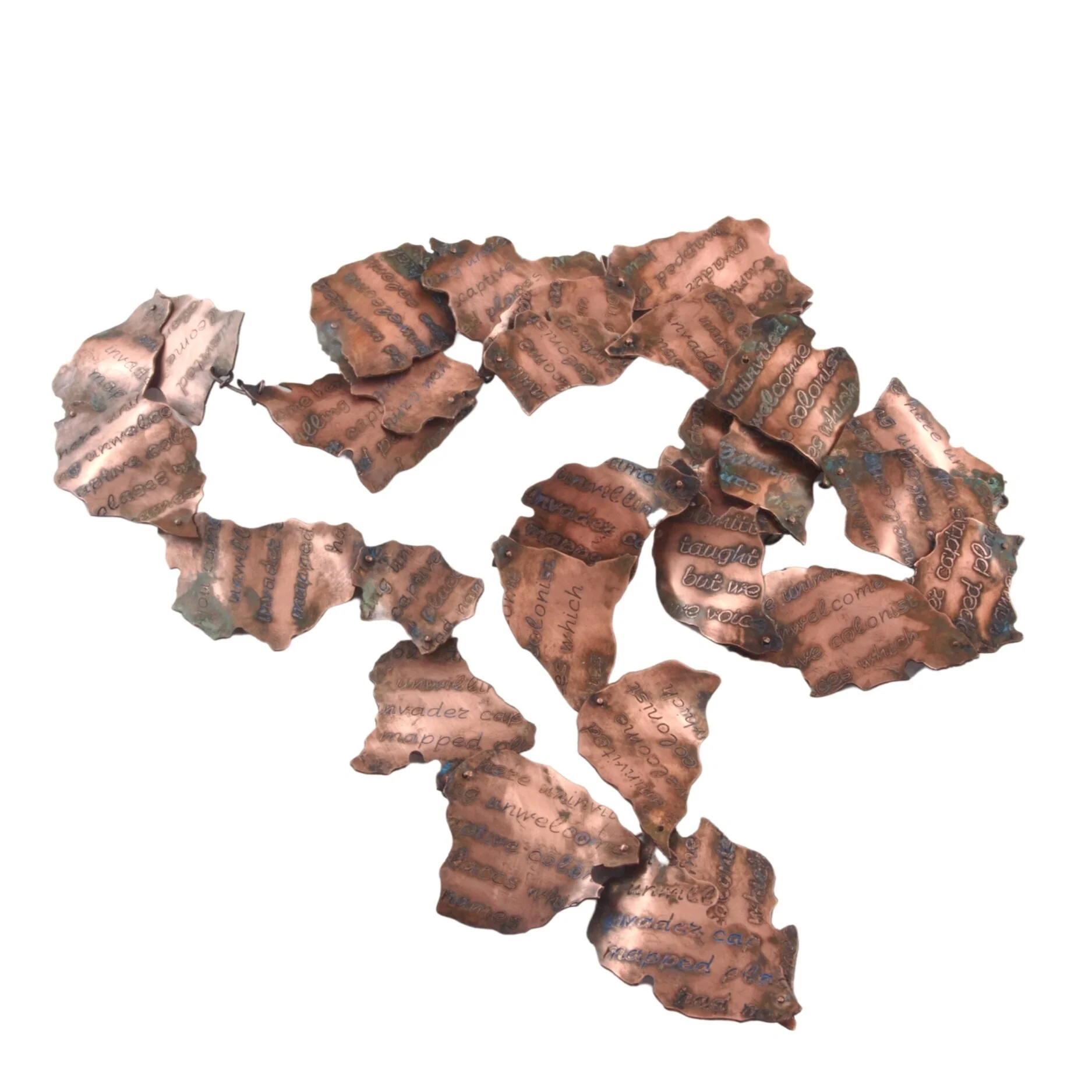 In these works, I write into metals, creating fragments of what I call ‘torn text’, a technique which enables me to add depth, context, and my voice to them. Emulating the edges of letters or diaries these fragments explore the truth of history, place, and our footprint on this earth. I use language as it speaks place, it helps us to construct the past, but it can also question the type of future we want.